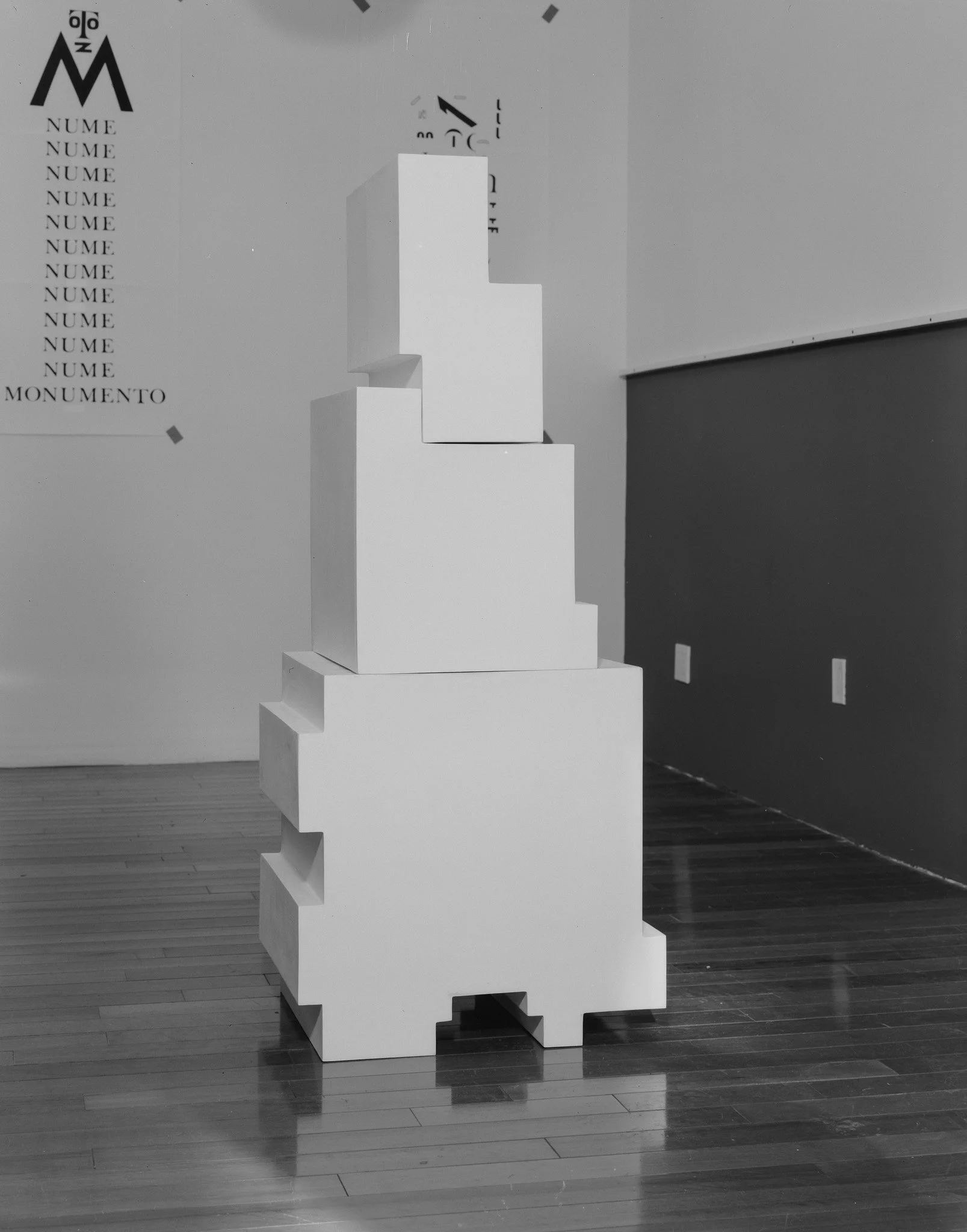 Untitled (B.S.o.A.), 2024. Chalk and rabbit skin glue on plywood, 74.5 x 22 x 24 inches, four units, arrangement variable. Broodthaers Society of America. Photo: Jeff Weber